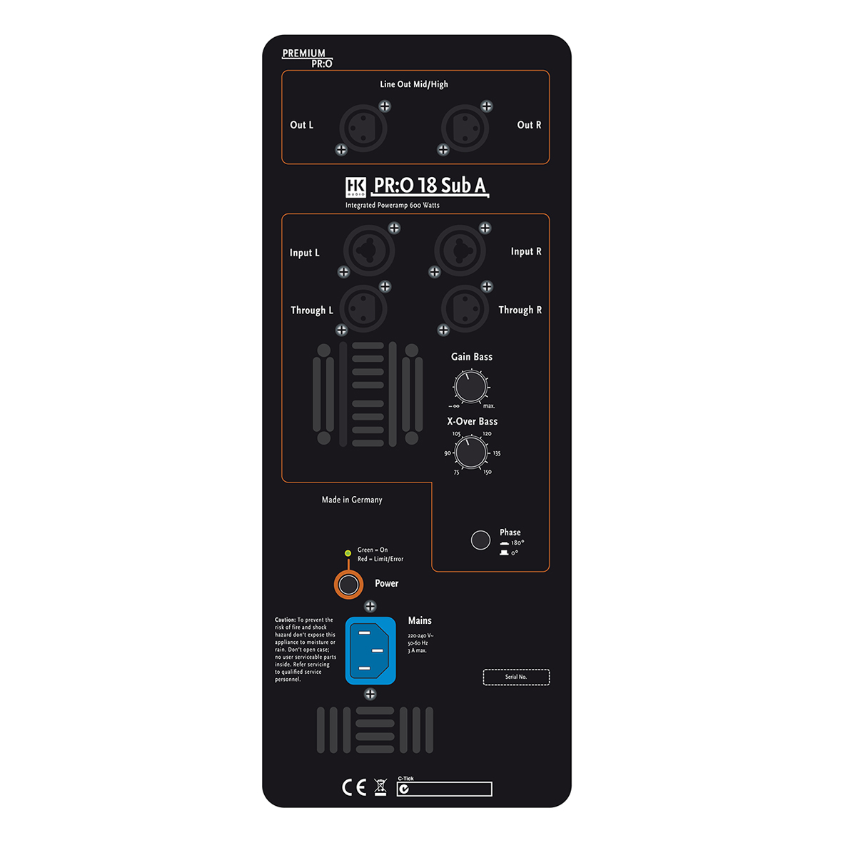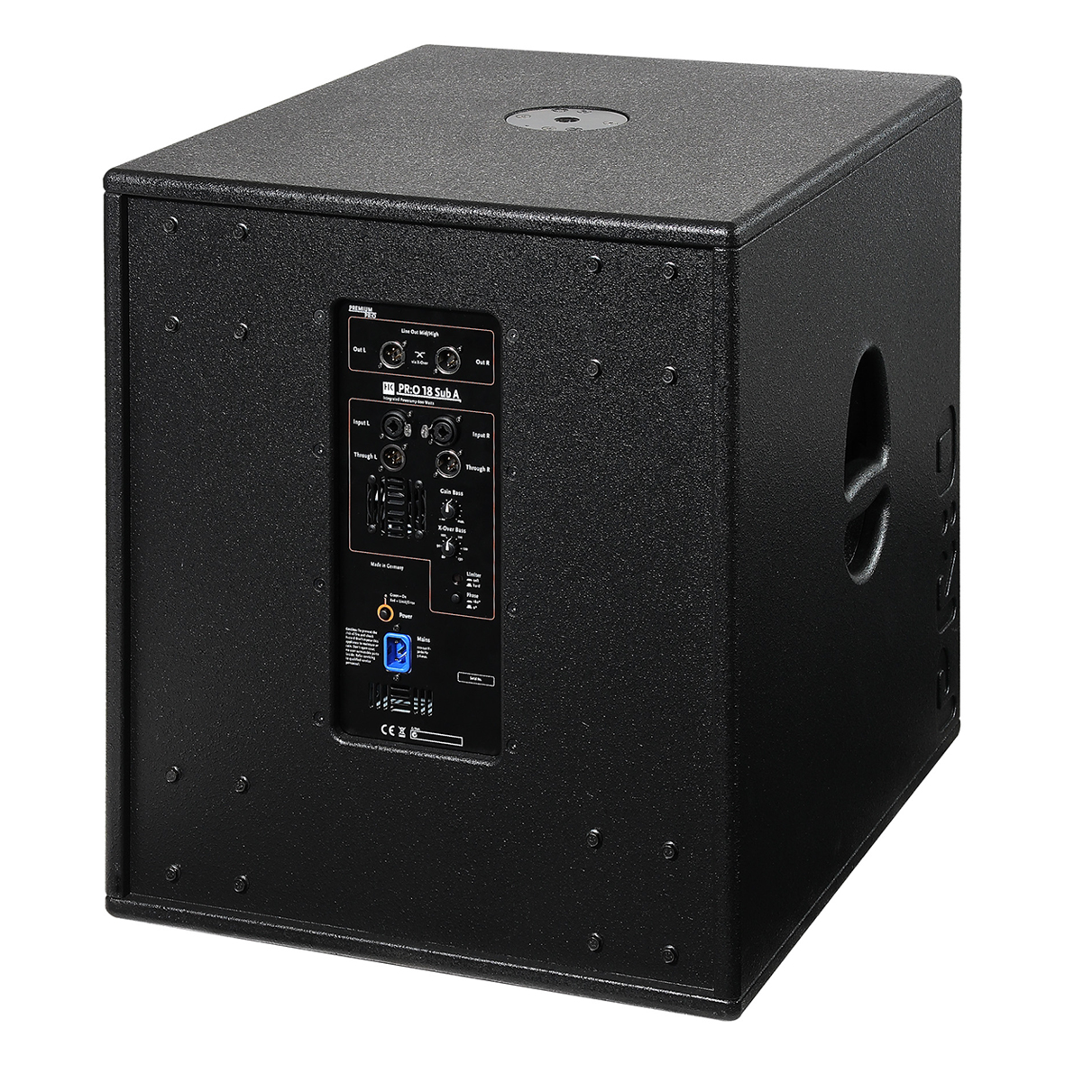Subwoofer wyposażony w 18-calowy głośnik niskotonowy w obudowie bass reflex, zapewnia bardzo nisko schodzącą podstawę basową. Specjalnie zaprojektowana aktywna zwrotnica kieruje odpowiedni zakres częstotliwości do głośników średnio/wysokotonowych podłączonych do wyjścia Satellite Out. Aktywny model PR:O18 SUB A ma zintegrowany wzmacniacz 600 W RMS i wyjście dla aktywnych satelit.