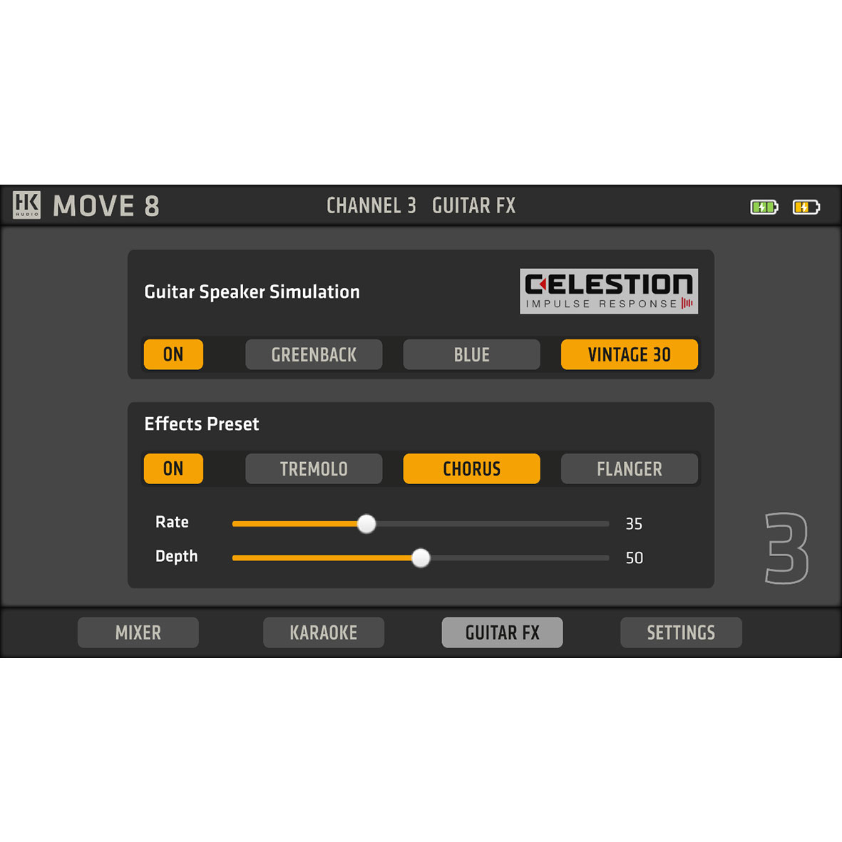 | Efekty | Reverb (kanały 1-3); Celestion Impulse Response symulator kolumn gitarowych na kanale 3 |